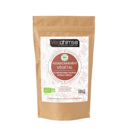 L’assaisonnement végétal sans “poulet grillé” Vegahimsa s’utilise comme une épice : soit mélangé dans une préparation soit saupoudré sur des plats. Il est biologique, sans gluten et sans sucres ajoutés.