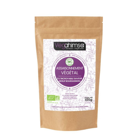 Avec l’assaisonnement végétal sans “Boeuf Bourguignon” Vegahimsa, vous pourrez retrouver les saveurs de ce grand classique de la cuisine française. Cet assaisonnement est composé d'ingrédients biologiques. La farine de maïs permet d’obtenir une recette sans gluten mais aussi d’épaissir la préparations à la cuisson.