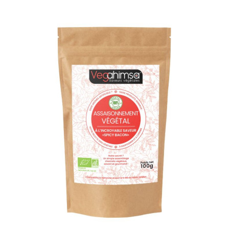 L’assaisonnement végétal “spicy bacon” de Vegahimsa : pour une cuisine créative ! Cette poudre bio s’utilise comme une épice, à saupoudrer sur vos plats en manque de saveurs. Elle combine des arômes naturels (issus d'extraits végétaux) et des épices.