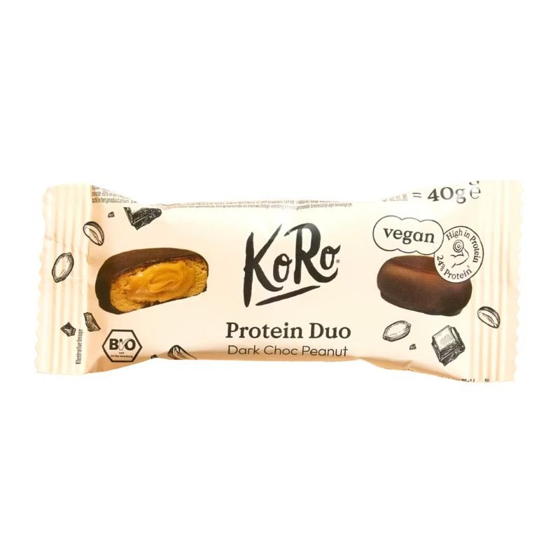 Découvrez les bouchées protéinées chocolat noir cacahuète de KoRo. Un duo incontournable pour un encas gourmand et protéiné : le croquant de la cacahuète associé au fondant du chocolat noir.