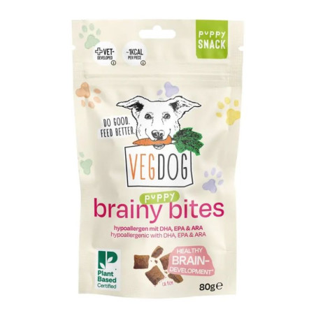 Offrez à votre chiot dès ses 8 semaines, une récompense aussi délicieuse qu’intelligente avec les Puppy Brainy Bites de VEGDOG. Ces petites bouchées croustillantes cachent un cœur savoureux qui capte instantanément l’attention, parfait pour motiver et récompenser lors des séances d’éducation.