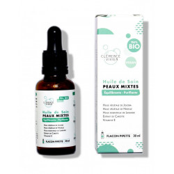 Une zone T qui brille, de petites imperfections ? L'huile de soin peaux mixtes Clémence et Vivien est faite pour vous ! Un complexe d'huiles végétales séborégulatrices et de vitamines pour une peau purifiée et équilibrée. Cette huile de soin est 100% naturelle et composée à 96% d'ingrédients bio.