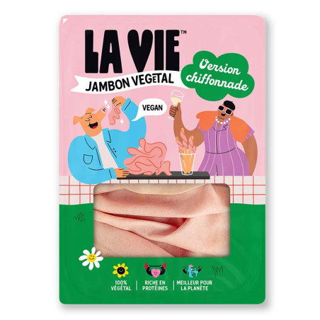Le jambon végétal façon chiffonnade La Vie c’est LE produit star de l'apéro ! Sa jolie couleur rosée et sa finesse vont séduire vos convives. Pour la composition, on retrouve à nouveau des protéines de pois, des protéines de soja ainsi que du jus concentré de radis (pour la couleur !).