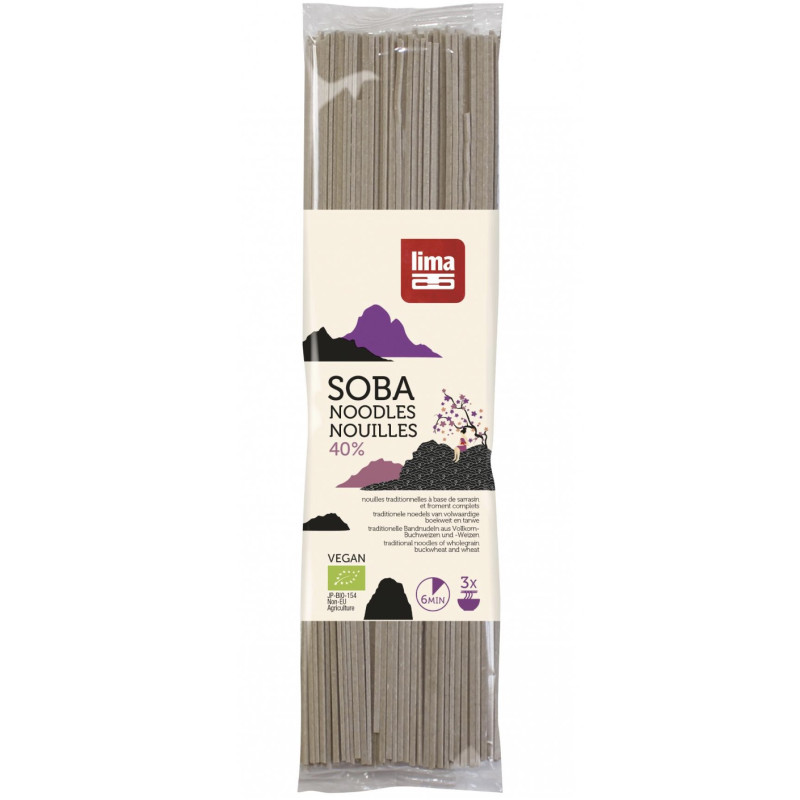 Les nouilles Soba Lima sont fabriquées à partir d'un mélange de farine complète de froment (62 %) et de farine complète de sarrasin (35 %).