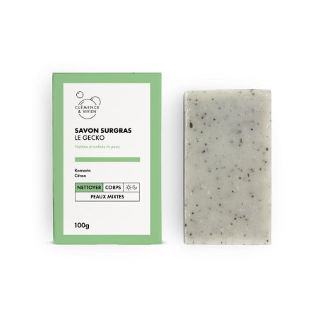 Le Gecko Clémence et Vivien est un savon surgras exfoliant et purifiant. Il est parfumé au romarin et au citron et exfolie en douceur avec les graines de pavot. Sa jolie couleur verte est obtenue avec l'argile verte ! Le Gecko est 100% naturel (avec beaucoup d'ingrédients bio), vegan et n'est pas testé sur les animaux.