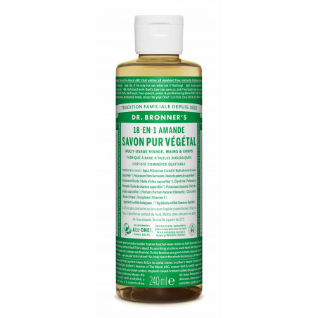 Retrouvez le savon végétal 18-en-1 Dr. Bronner's à la senteur sucrée d'amande.