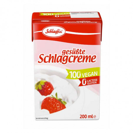 Découvrez la version sucrée de la schlagcreme Schlagfix ! Une préparation végétale à fouetter, déjà sucrée pour vos desserts. Il ne reste plus qu’à la monter au fouet et à la déguster. Sa stabilité en fait l’ingrédient parfait pour la garniture ou le topping de vos pâtisseries préférées : bavarois vegan, tartes aux fruits.