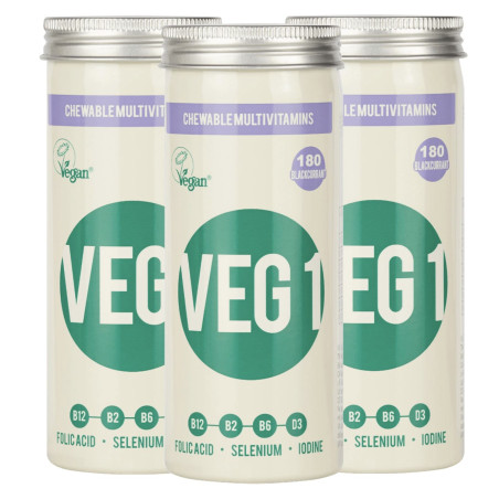 Le complément multi-vitaminé VEG 1 au cassis, maintenant disponible en lot de 3 boîtes de 180 comprimés.
