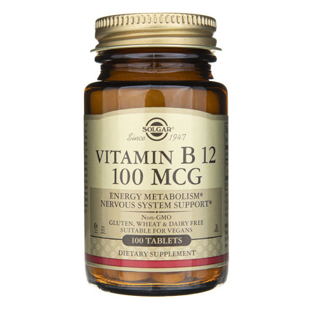 Retrouvez la vitamine B12 Solgar 100mcg en 100 comprimés : une vitamine B12 dosée à 100mcg sous forme de cyanocobalamine. Cette vitamine soutient le système nerveux et immunitaire, et maintient une bonne énergie et un bon fonctionnement du métabolisme.